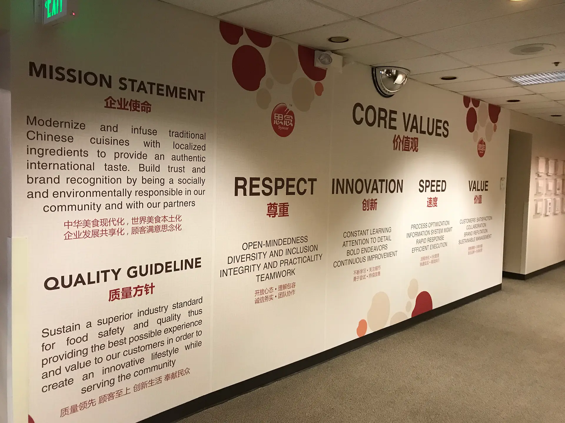 Effective wall graphic design begins with brand discipline. We translate established brand guidelines into large-scale graphics that maintain proper color values, proportions, and spacing. This includes logo applications, mission statements, timelines, and abstract visual elements that support your brand personality without overwhelming the space. Our designers consider viewing distance, lighting conditions, wall texture, and traffic flow to ensure the final composition reads clearly and consistently throughout the office. Each wall graphic solution is designed specifically for the environment it occupies, not adapted from a generic template. When appropriate, we incorporate interior wall graphics to support brand storytelling in high-visibility areas.